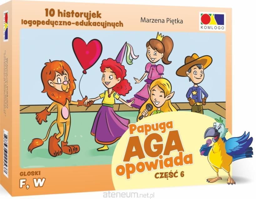 "Papuga Aga opowiada. Część 6 - f, fi, w, wi" to zestaw 10 historyjek obrazkowych 4-elementowych, które można wykorzystać w terapii logopedycznej i zabawach ogólnorozwojowych dzieci w wieku przedszkolnym i wczesnoszkolnym. Zawartość pudełka: 10 historyjek 4-elementowych (110 x 140 mm), książeczka (140 x 110). Autorka: Marzena Piętka Historyjki umożliwiają: ćwiczenie artykulacji, rozwijanie słownictwa biernego i czynnego, rozumienie dłuższych wypowiedzi, ćwiczenie opisywania i opowiadania, rozwijanie wyobraźni i myślenia, w tym myślenia przyczynowo-skutkowego. W książeczce znajdują się krótkie opowiadania związane z historyjkami. Pogrubieniem zaznaczono w nich wyrazy z ćwiczonymi głoskami: f, fi, w, wi.