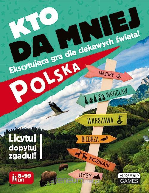 Kto da mniej Polska to świetna i emocjonująca gra karciana dla całej rodziny, w której można sprawdzić swoją wiedzę na temat polskiej przyrody, historii, geografii oraz kultury. Podczas rozgrywki liczy się spryt, odwaga i umiejętność wyciągania wniosków. Zadaniem każdego z graczy jest odgadnięcie jakie polskie miejsca oraz zabytki ukrywają się na kartach, przy jednocześnie jak najmniejszej liczbie zadanych pytań.