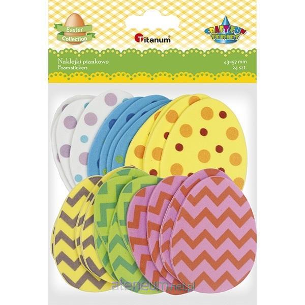 Naklejki piankowe: pisanki 43 x 57 mm, zielone, niebieskie, żółte, różowe, białe. 24 sztuki.