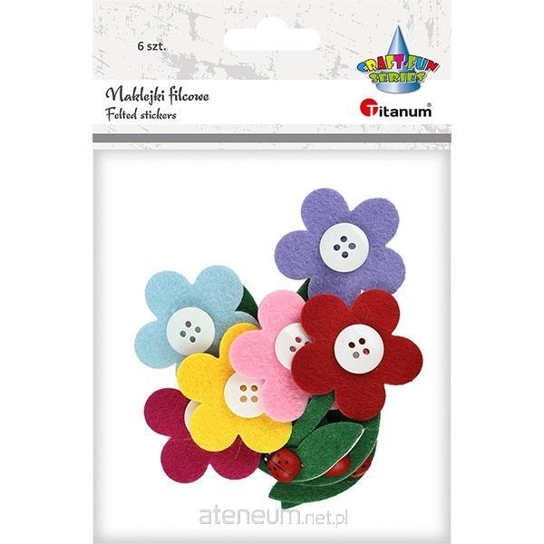 Naklejki filcowe 3D: kwiaty z guzikowym środkiem i drewnianą biedronką - 6 sztuk.