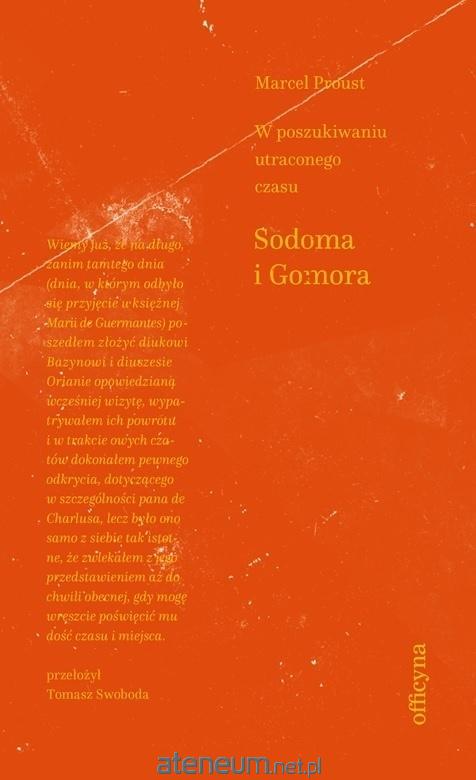 Na dziedzińcu stał sobie kwiatek i czekał na trzmiela, który by go zapylił. To się nie mogło wydarzyć, a jednak się wydarzyło. Potem jest już tylko ciekawiej. Proustowski bohater marzy o tym, aby przedstawiono go księciu de Guermantes, a zarazem lęka się, że głośno wypowiedzą jego imię. Swann jest już bardzo chory, więc ustępuje miejsca baronowi de Charlus. To brat diuka de Guermantes gra tu bowiem pierwsze skrzypce, chociaż potrzebuje do tego prawdziwego skrzypka. Bohater po raz drugi odwiedza Balbec, dogłębnie poznając hotelowy personel, a przede wszystkim klan Verdurinów. Spędza coraz więcej czasu z Albertyną, lecz pośród wahań serca powraca też myślami i we śnie do śmierci babki. Podróże po okolicy okraszone są etymologicznymi tyradami profesora Brichota, które sprawiają, że magia imion nabiera nowego znaczenia. A, i jeszcze miłość także cielesna okazuje się nie tak oczywista, jak to się zdawało. I w ogóle wszyscy są tu jakby sobą i zarazem swoją odwrotnością. Świat jest w ciągłym ruchu, niczym lokalna kolejka obwożąca pasażerów po normandzkich plażach. To świat Sodomy i Gomory najbardziej powieściowego, przygodowego tomu Proustowskiego cyklu W poszukiwaniu utraconego czasu. To także tom najbardziej chyba autonomiczny, pozwalający choć wbrew woli autora na lekturę w oderwaniu od pozostałych części. Teraz w nowym przekładzie Tomasza Swobody.