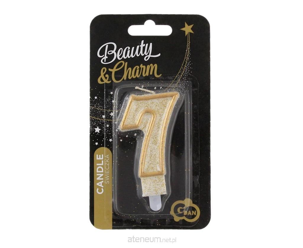 Świeczka CYFRA 7 urodziny, złoty kontur Wysokość świeczki: 6,5 cm Wysokość świeczki z podstawką: 9 cm Ilość sztuk w opakowaniu: 1 Kolor: złoty kontur Przepiękna świeczka Cyfra 7 złota to doskonała dekoracja każdego urodzinowego tortu. Świeczka w kształcie cyfry 7 (siedem) ozdobiona złotą brokatową posypką. Dzięki specjalnej stopce, świeczkę łatwo się umieszcza na torcie, dzięki czemu cyfra jest w całości widoczna a dziurka w torcie jest bardzo mała. Dodatkowo stopka zapewnia stabilność świeczki. Idealna ozdoba tortu dla dziecka i osoby dorosłej. Sprawdzi się także na wszelkiego rodzaju rocznicach, firmowych imprezach i wszędzie tam, gdzie z cyfr można ułożyć liczbę lub rok.