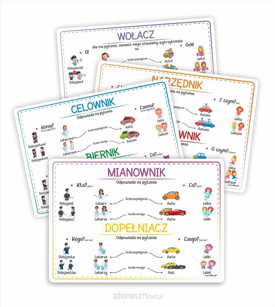 Zestaw zawiera 4 kolorowe karty, na których znajdziemy 7 przypadków i aż po 4 przykłady do każdego z nich! - w liczbie pojedynczej oraz mnogiej.