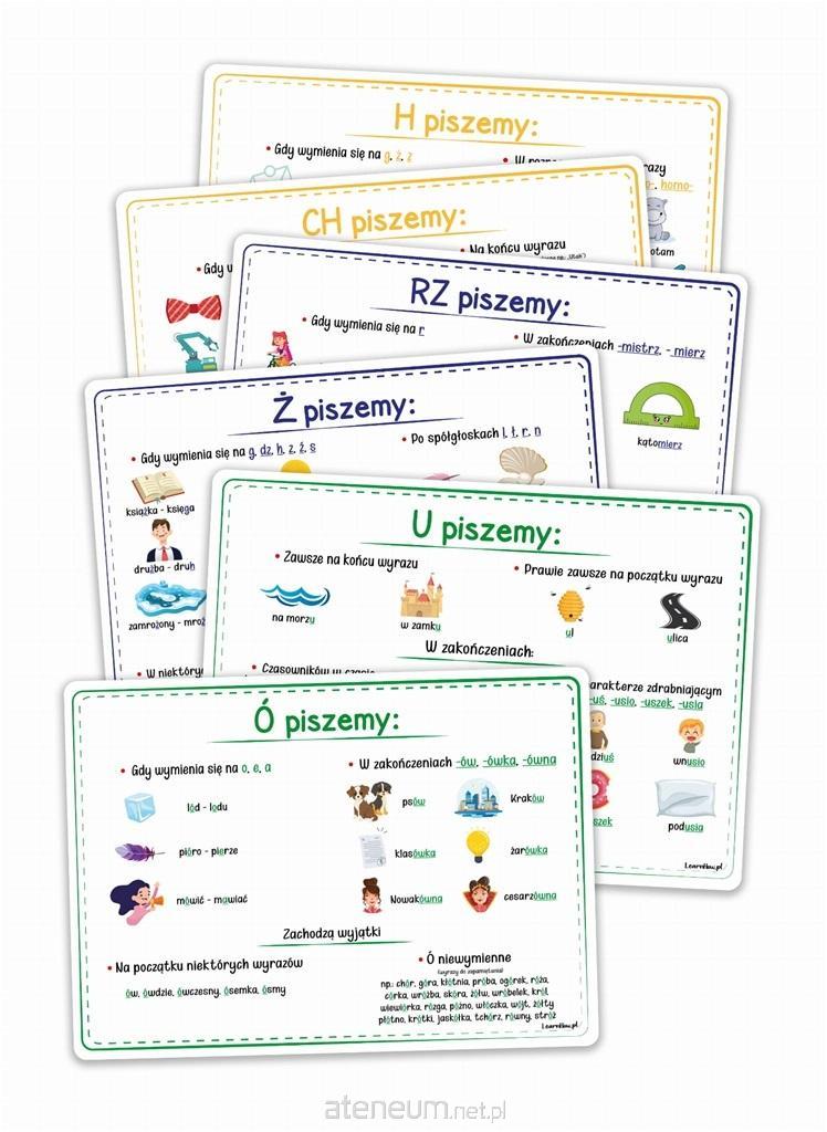 Plansze wyjaśniające zasady ortografii razem z przykładami.