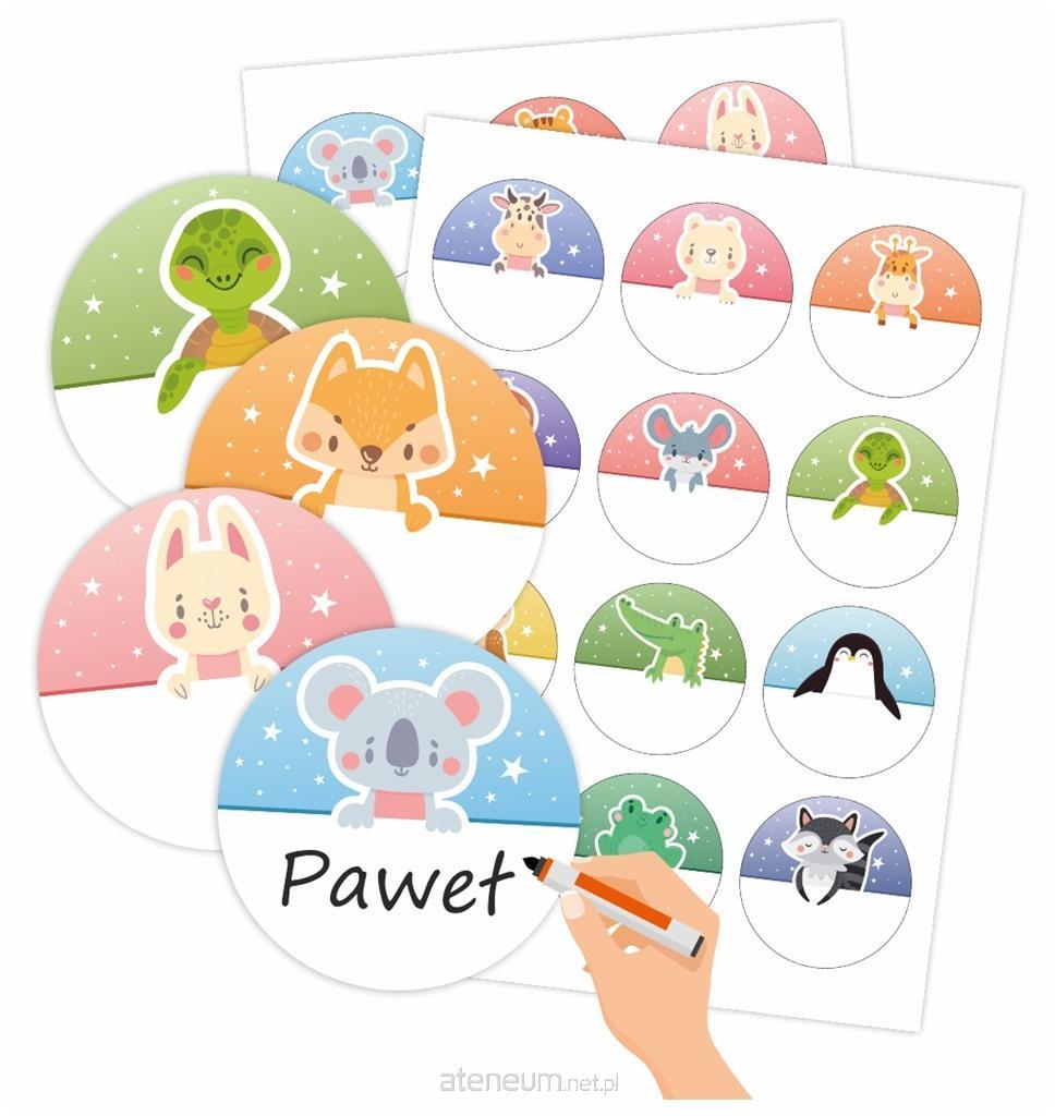 Na każdej naklejce znajduje się inne zwierzątko oraz miejsce na wpisanie imienia dziecka.