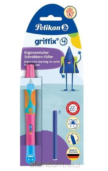Pióro wieczne Pelikan Griffix to etap 4 i zarazem ostatni w 4-stopniowym systemie nauki pisania opracowanym przez markę Pelikan. Na tym poziomie dziecko posiada już rozwinięty chwyt szczypcowy, potrafi kreślić precyzyjne kształty i stosuje właściwy nacisk podczas pisania. Pióro zostało zaprojektowane z myślą o utrwalaniu tych umiejętności i wprowadzeniu dziecka w świat pisania piórem wiecznym z pełnym komfortem i kontrolą. Stalówka ze stali nierdzewnej, częściowo schowana w obudowie, jest odporna na nacisk i nie wymaga wysiłku gładko sunie po papierze, nie drapiąc i nie przerywając linii. Dziecko może też kontrolować ilość atramentu dzięki specjalnemu okienku w obudowie, a odkręcana nasadka zapobiega przypadkowemu pobrudzeniu dłoni i piórnika. Trójkątna, ergonomiczna i antypoślizgowa strefa chwytu oraz widoczna uśmiechnięta buźka pomagają dziecku w utrzymaniu właściwej pozycji palców i dalszym rozwijaniu umiejętności pisarskich.