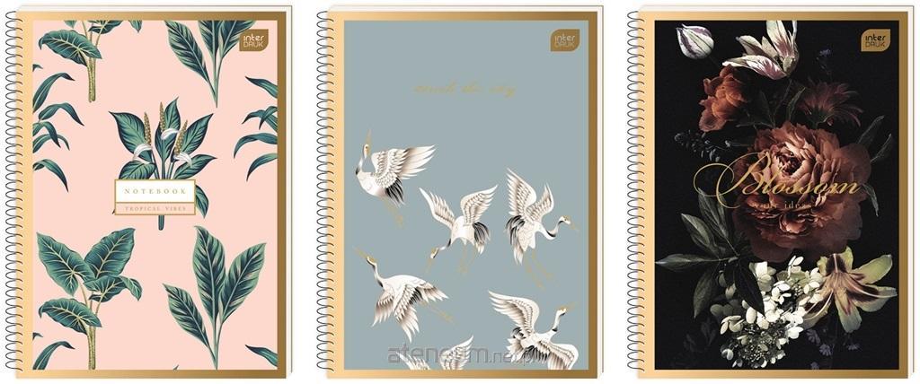 Format: A4. Liczba kartek: 50. Zadruk w kratkę. Pojedyncza spirala wkręcana. Otwory do segregatora. Perforacja wzdłuż grzbietu, ułatwiająca wyrywanie kartek. Spirala po długim boku. Okładka z efektem satynowej metalizy z modnym motywem natury lub z abstrakcyjnym wzorem