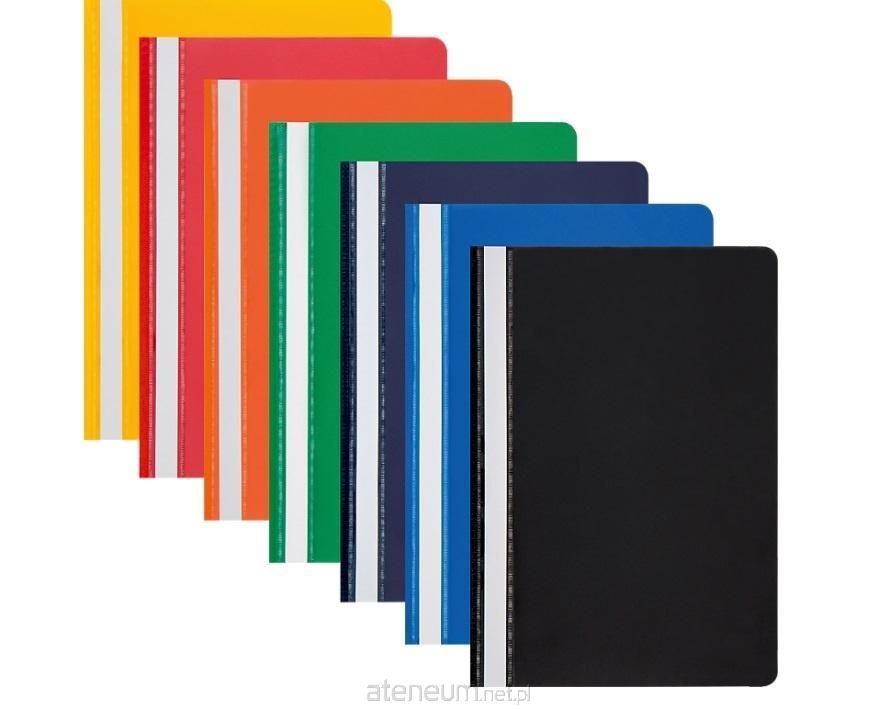 Przezroczysta przednia okładka, tylna kolorowa. Na grzbiecie papierowy pasek do opisu, zaokrąglone wąsy, Pojemność do 200 kartek.