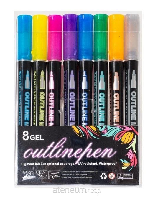 Zestaw 8 markerów metalicznych z dwiema kolorowymi liniami i srebrnym wewnętrznym śladem, fibrowa końcówka ze śladem 3 mm, tusz pigmentowy, UV i wodoodporny. Do różnych powierzchni - kartonu, szkła, ceramiki, płótna, drewna, skóry, dżetów, plastiku