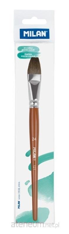 Szkolny płaski pędzel serii 121 nr 24 z krótkim drewnianym trzonkiem. Skład: 70% naturalnego włosia koziego + 30% syntetyczne. Brązowe lakierowane wykończenie i aluminiowa skuwka bez spawania, odporna na rdzewienie. Bardzo miękkie włosie idealne do technik akwarelowych, wodnych i plakatowych. Lepsze zatrzymanie wody i farby. Gładsza linia. Lepsza odporność i elastyczność, co ułatwia odzyskanie kształtu po jego użyciu. Szerokość włosia: 18 mm. Grubość włosia: 4,8 mm. Długość włosia: 22,8 mm. Długość pędzla: 209 mm.