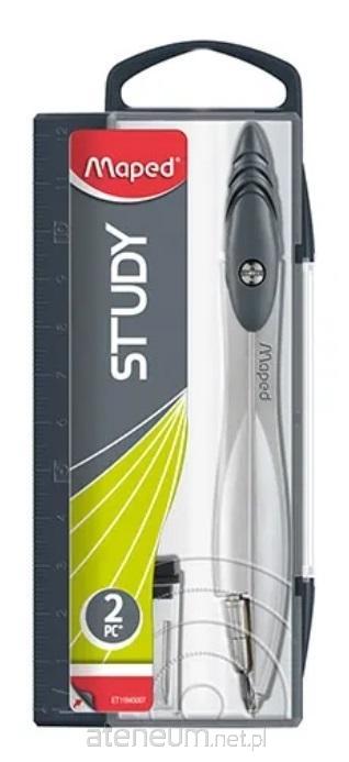 Metalowy cyrkiel STUDY na grafity. Plastikowe etui z wbudowaną linijką długości 12 cm zawiera cyrkiel STUDY oraz zapasowy grafit o średnicy 2 mm. Główka cyrkla w kolorze czarnym. JS.: 1 etui.