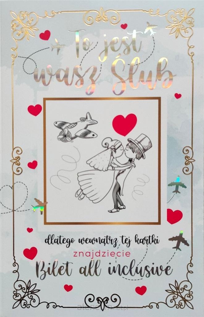 Karnet 5k z biletem to wyjątkowy pomysł na sprawienie młodej parze wesołej i niebanalnej niespodzianki. Wykonane z wysokiej jakości grubego papieru o gramaturze 350g i uszlachetnione złoceniem oraz tłoczeniem i brokatem. Oryginalne i wesołe teksty zaskoczą parę młodą i z pewnością wywołają uśmiech na ich twarzach. Karnet może być idealnym dodatkiem do każdego prezentu. Karnet zawiera również humorystyczne życzenia.