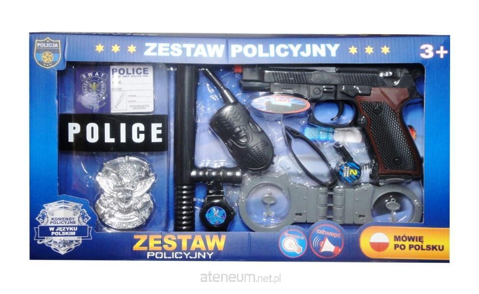 Zabawka z dźwiękami syreny policyjnej, strzelania, przeładowania broni oraz komendami policyjnymi w języku polskim.