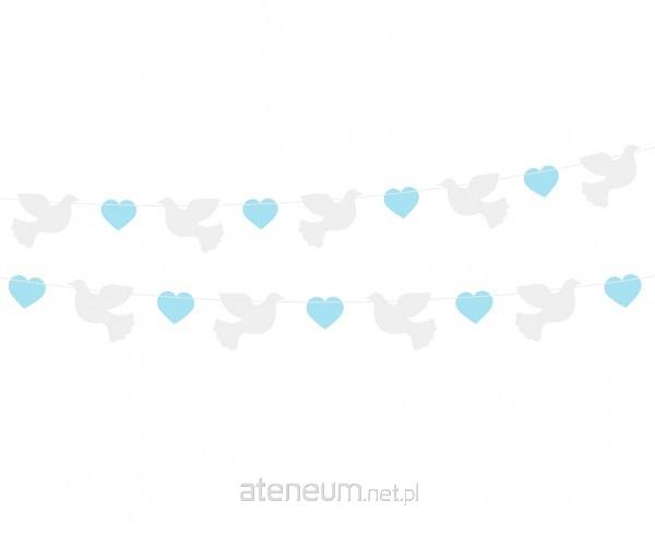 GIRLANDA PAPIEROWA Z BIAŁYMI GOŁĄBKAMI I NIEBIESKIMI SERDUSZKAMI Długość: 150 cm Materiał: papier Kolor: niebieskie serduszka, białe gołąbki W opakowaniu: 1 szt. Producent: Godan S.A.