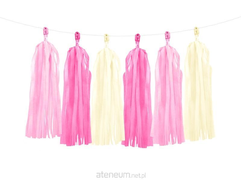 Girlanda frędzle, do samodzielnego złożenia, zestaw zawiera 12 frędzli (po 4 x kremowy, różowy i ciemnoróżowy) i ok. 2 m białego sznurka, wymiary po złożeniu: wysokość ok. 30 cm, długość ok. 1,5 m.