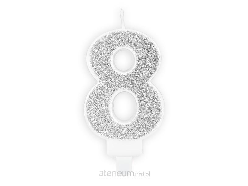 Świeczka urodzinowa Cyferka 8 w kolorze srebrnym brokatowym, rozmiar ok. 7 cm.