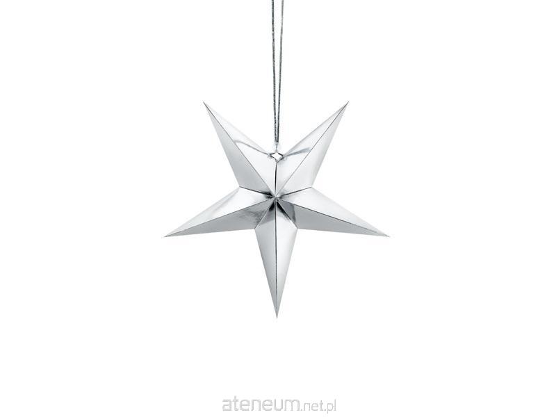 Gwiazda papierowa pięcioramienna wykonana ze srebrnego lustrzanego papieru, ze srebrnym sznurkiem, średnica ok. 30 cm. Produkt do samodzielnego złożenia.