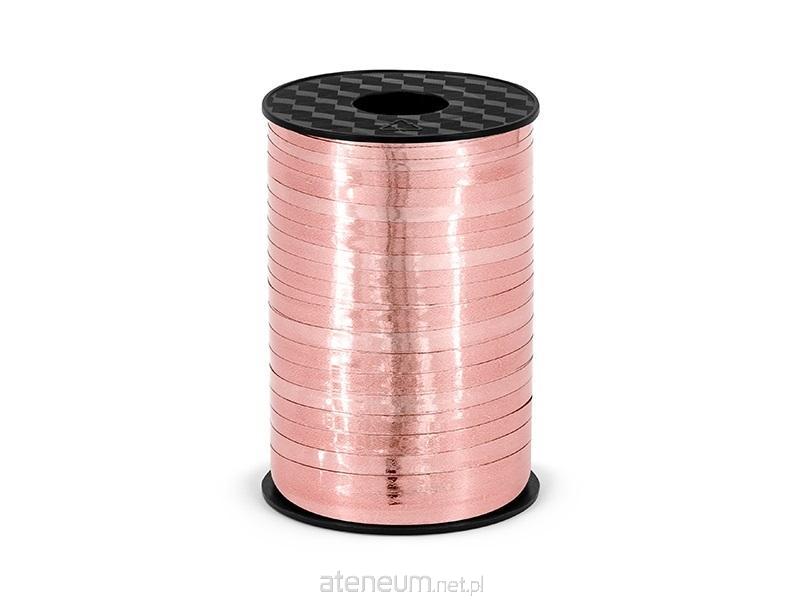 Wstążka plastikowa metalizowana w kolorze różowego złota, szerokość ok. 5 mm, długość ok. 225 m.