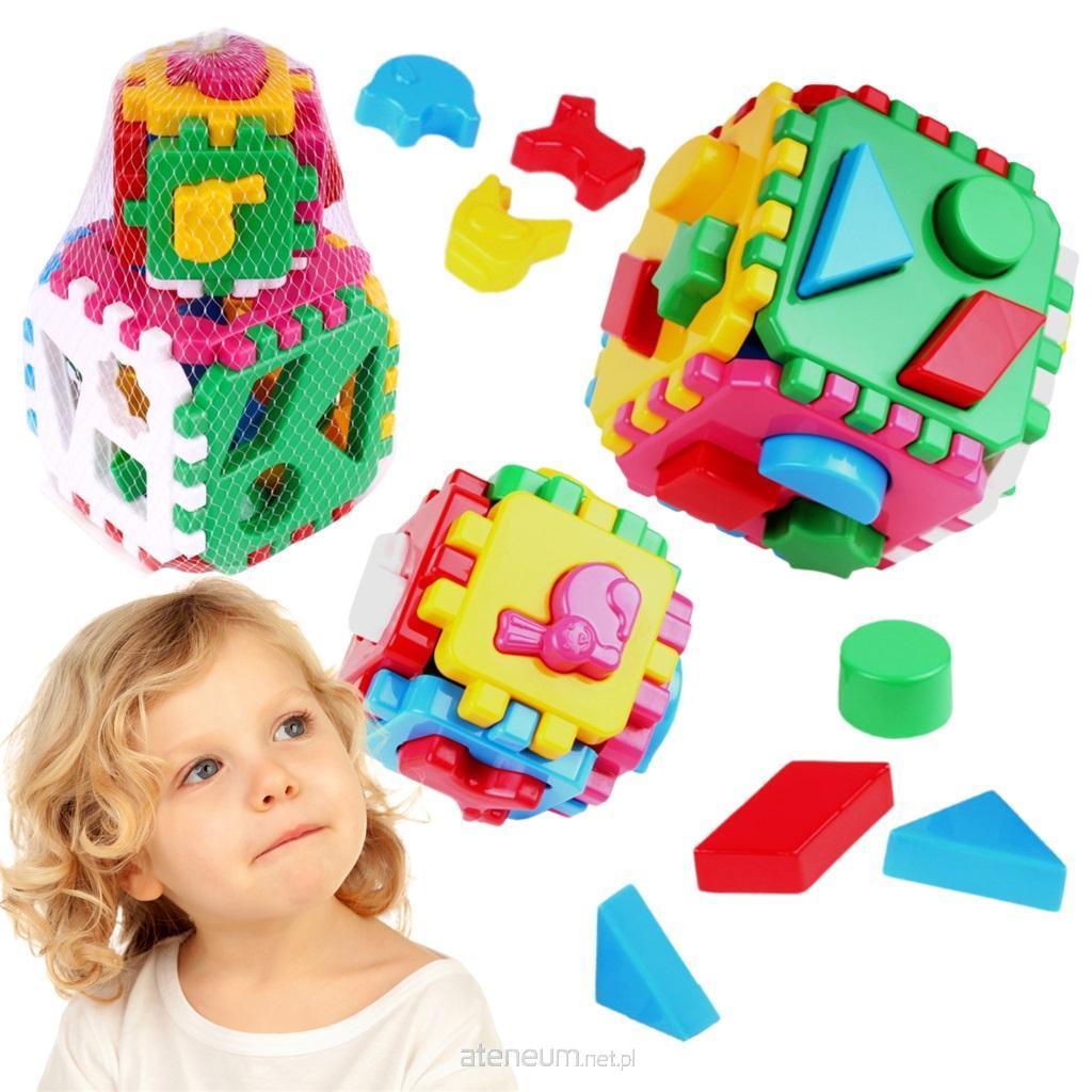 Zestaw dużych i małych kostek z figurami geometrycznymi oraz figurkami zwierząt.