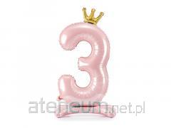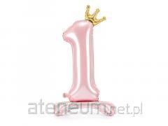 Metalizowany balon foliowy Cyfra 1 w kolorze jasnoróżowym z koroną w kolorze złotym, wymiary przed napompowaniem ok. 37 x 100 cm (15 x 39''), wymiary po napompowaniu ok. 30 x 92 cm (12 x 36''). Do napompowania powietrzem i helem.
