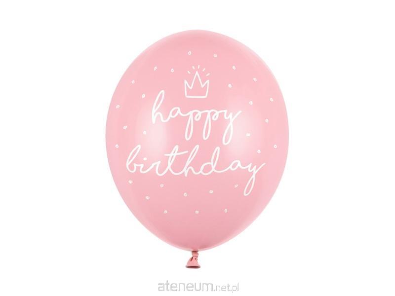 Balony Strong happy birthday z białym pięciostronnym nadrukiem, w kolorze Pastel Baby Pink, średnica 30 cm.(1 op. / 6 szt.)