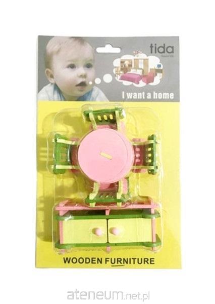 Drewniane mebelki dla lalek szafka, stolik z 4 krzesłami. Produkt zapakowany w kartonową podstawkę z przezroczystym kloszem.