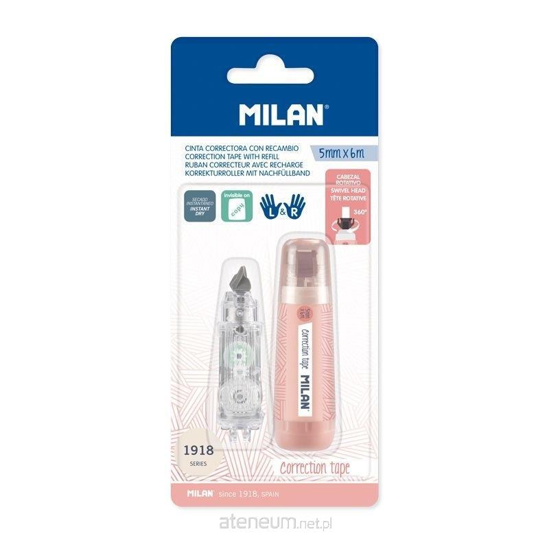 Cylindryczna taśma korekcyjna z serii 1918 w kolorze różowym. Odpowiedni dla osób leworęcznych dzięki obrotowi końcówki o 360 stopni. Szybko, czysto i precyzyjnie. Korekty na wszystkich rodzajach papieru, nie pozostawia śladów na kserokopii lub faksie. 5 mm szerokości x 6 m długości. W zestawie wkład taśmy. Seria 1918 jest inspirowana oryginalnymi kolorami i wzornictwem gumek MILAN.