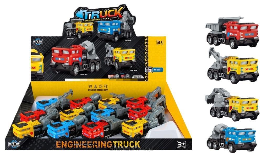 Modele samochodów: koparka, betoniarka, dźwig, wywrotka.
