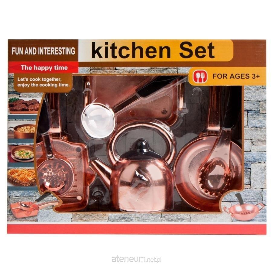 Zawartość zestawu: czajnik, taca, patelnia, patelnia do grillowania, chochelka, łyżka do makaronu oraz łyżka cedzakowa. Wszystkie elementy wykonane z plastiku.