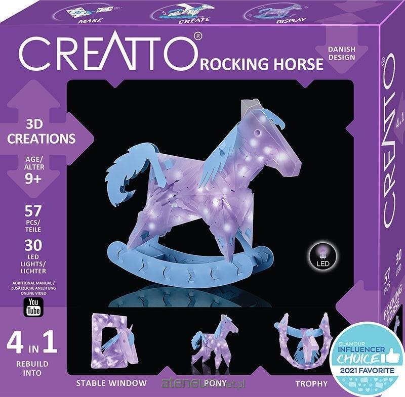 CREATTO to doskonały sposób, żeby spędzić czas z dzieckiem, jednocześnie razem tworząc coś magicznego. Z wytrzymałych, plastikowych elementów tworzymy trójwymiarowe figurki, które są podświetlane od środka światełkami LED. Mogą służyć nie tylko jako niezwykła lampka nocna ale również przywoływać wspomnienia wspaniałej, wspólnej zabawy. Używając tego zestawu można stworzyć konika na biegunach, konia w stajni, kucyka lub trofeum.