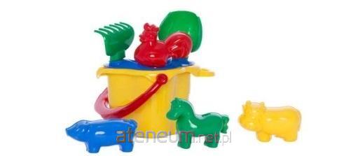 Zestaw zawiera wiaderko "Kogucik" z sitkiem, łopatkę, grabki oraz 4 foremki w kształcie zwierzątek. Poszczególne elementy są małe i lekkie. Idealne do podróży