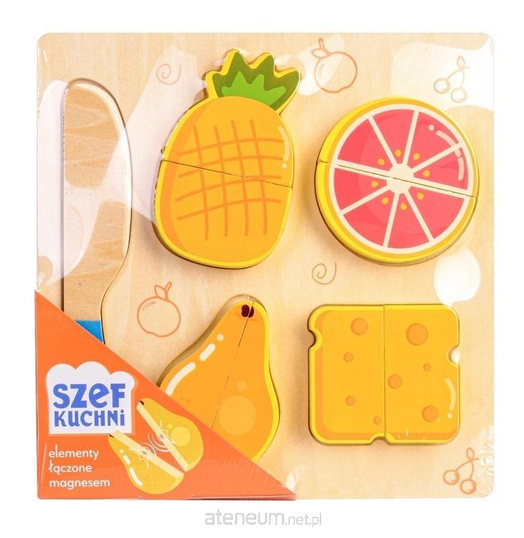 Zestaw "Szef kuchni" rozwija wyobraźnię, kreatywność oraz motorykę dziecka. Zabawa zestawem daje możliwość poznania owoców, warzyw i przekąsek, zachęca do gotowania oraz nauki o zdrowym odżywianiu. Wszystkie elementy wykonane są z drewna, pokryte bezpieczną dla dzieci farbą. Elementy połączone magnesem.