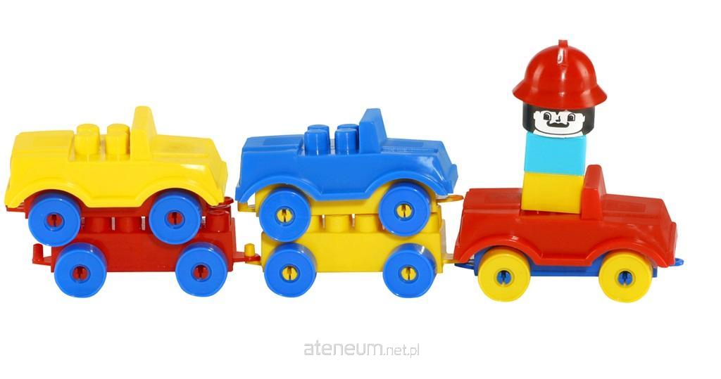 Zabawka imituje model samochodowego pociągu, który został wykonany w całości z klocków. W zestawie znajduje się kierowca na samochodzie oraz dwie lawety z samochodzikami.