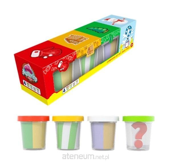 Zestaw kolorowej masy plastycznej. Zestaw składa się z 4 mas plastycznych. Każda masa ma w sobie 2 lub 3 kolory. Jedna masa plastyczna jest niespodzianką. Po zakończonej zabawie, ciastolinę należy chować do kubeczków, aby uniknąć jej wyschnięcia (a dalej kruszenia). Produkt dla dzieci od 3 lat.