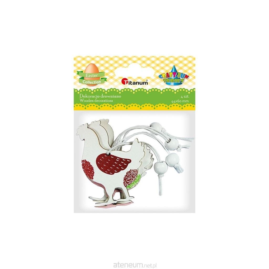 awieszki drewniane, wzór: kury, wymiary: 48 x 62 mm, z koralikiem 10 mm białym na sznureczku, kolory: biało-zielona, różowo-biała, biało-różowa, biało-czerwona. 4 sztuki.