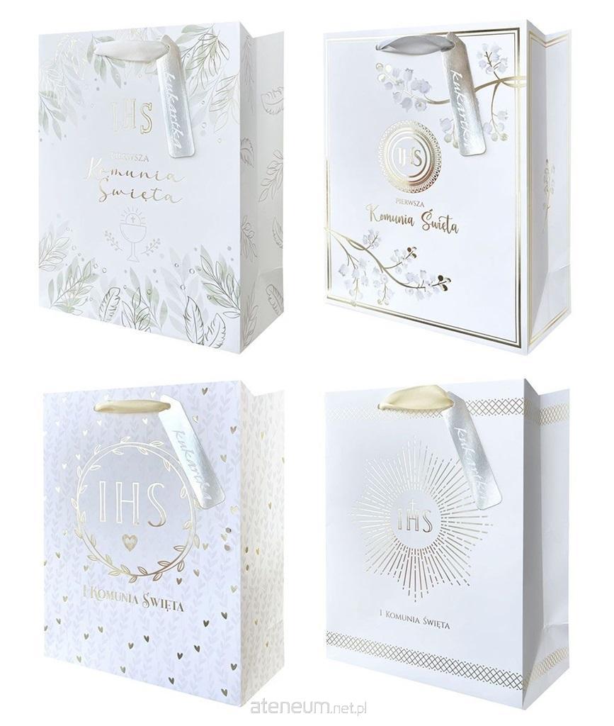 Torby z serii QP, oprócz świetnej jakości serii Q, wyróżniają się posiadaniem dodatkowego elementu dekoracyjnego - np.. doklejanej kokardki lub odstawnika, grubszego brokatu, złoconej zawieszki itp.. W takiej torbie każdy prezent zyskuje na prestiżu. Cechy szczególne: typ produktu: torba na prezent, zdobienie: metaliczna folia, wielkość orientacyjna: 26 x 13 x 32 cm (szerokość x głębokość x wysokość), okazja: Komunia.