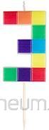 Świeczka urodzinowa w kształcie cyfry 0 z motywem kolorowych klocków. Idealna jako dopełnienie dekoracji tortu. Posiada element umożliwiający stabilne wbicie świeczki w ciasto. Wysokość świeczki to 7 cm.