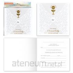 "Kartka okolicznościowa z okazji Pierwszej Komunii Świętej o treści: W uroczystym dniu pierwszej Komunii Świętej życzymy Ci obfitych Łask Bożych, a Sakrament Eucharystii niech umacnia w Tobie wiarę , nadzieję i miłość."