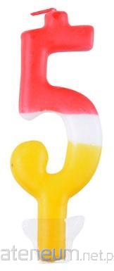 Świeczka urodzinowa w kształcie cyferki wykonana z trójkolorowego wosku: czerwonego, białego i żółtego. Wysokość świeczki 10,5 cm.