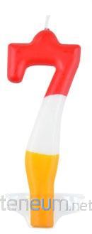 Świeczka urodzinowa w kształcie cyferki wykonana z trójkolorowego wosku: czerwonego, białego i żółtego. Wysokość świeczki 10,5 cm.