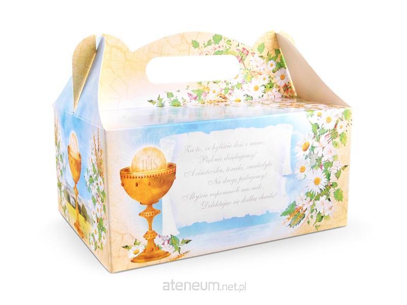 Ozdobne pudełka na ciasto komunijne z papieru z kolorowym nadrukiem i wierszykiem, wymiary pudełka po złożeniu 19x14x9 centymetrów.(1 op. / 10 szt.)