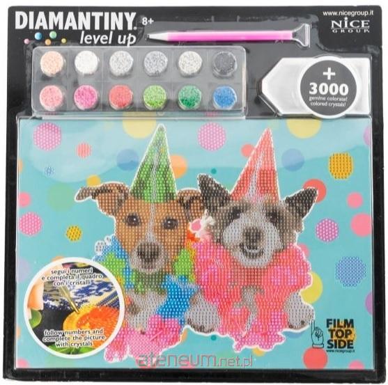 Zestaw z kryształkami do tworzenia mozaiek z kolorowymi kamieniami. Zabawa z mozaiką diamentową polega na układaniu obrazka z tysięcy malutkich, kolorowych diamencików według naniesionego na kartonie nadruku. Obrazek pokryty jest warstwą klejącą, która utrzymuje kryształki na odpowiednich miejscach. Kompletny zestaw do wykonania mozaiki zawiera: obrazek nadrukowany na grubej tekturze, na którym naniesione są literki i cyferki wskazujące miejsca, gdzie należy ułożyć poszczególne kolory; diamenciki w różnych kolorach; aplikator z woskiem, pojemnik na diamenciki oraz przewodnik po kolorach.Zawartość: