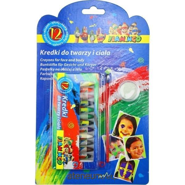 Kredki przeznaczone do malowania twarzy i ciała. Łatwo się rozprowadzają. Trwałe - pozostają na skórze nawet w trakcie aktywnej zabawy i nie rozmazują się. W łatwy sposób usuwają się pod wpływem wody z mydłem lub mleczka kosmetycznego. Zestaw zawiera: kredki 12 kolorów, brokat sypki oraz pędzelek.