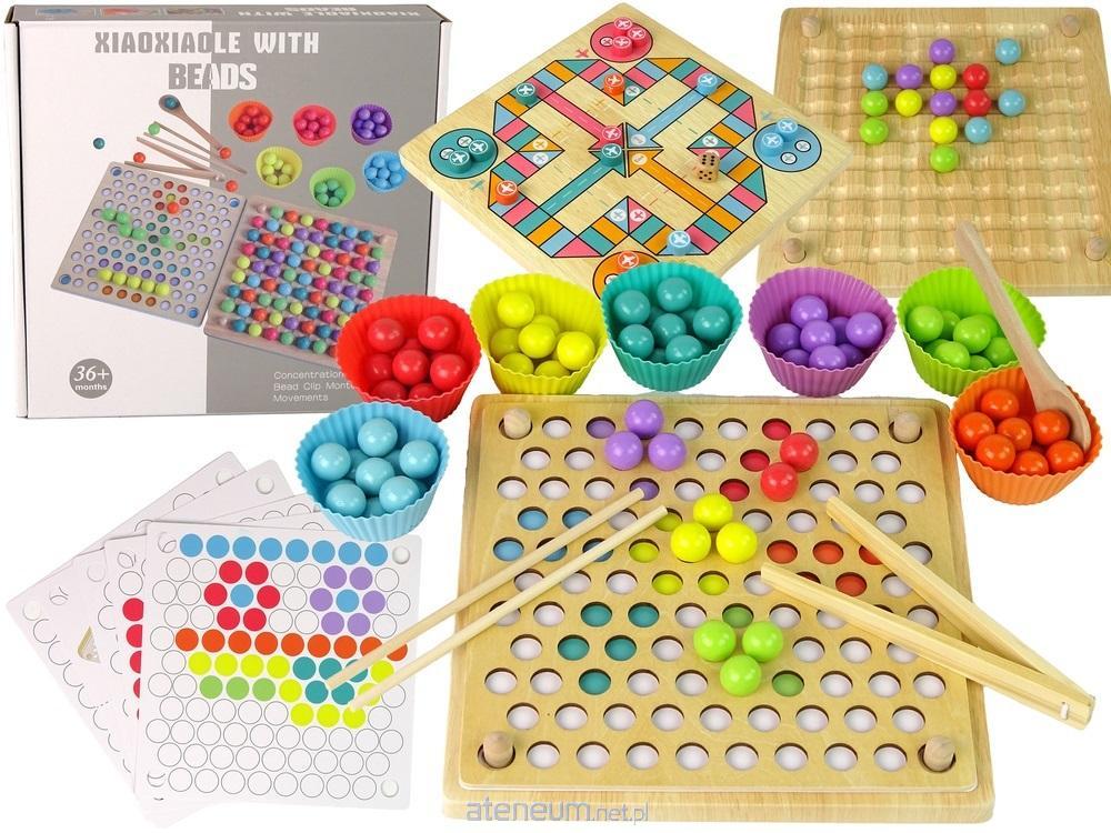 Drewniana Gra Kulki Koraliki Plansza Edukacyjna Chińczyk Dobrze wykonana zabawka edukacyjna z wieloma różnymi opcjami do zabawy. Ta drewniana zabawka dla maluchów umożliwia naukę rozpoznawania kształtów i kolorów. Gwarantuje rozwój umiejętności logicznych i wiele godzin zabawy. Zabawka wykonana jest z drewna to ponadczasowa propozycja, która zachwyci każdego malucha. Naturalny surowiec powoduje, że nawet jeżeli dziecko weźmie zabawkę do buzi, nie będzie miało styczności ze sztucznymi tworzywami. Ta sortująca zabawka dla maluchów z różnymi żywymi kolorami może pomóc dzieciom rozwijać zdolności manualnych, koordynacje wzrokowo-ruchową oraz cierpliwość i koncentrację. Zabawa polega na układaniu kuleczek na specjalnej planszy. Losujesz kartę z przykładowym wzorem i starasz się dopasować ułożeniem i kolorystyką. Pojemniczki w kształcie foremek pozwalają na posortowanie kuleczek. W zestawie znajdują się także obrazki, które można stworzyć ze znajdujących się w zestawie elementów. Jak układać kuleczki? Tu mamy utrudnienie, do dyspozycji mamy pałeczki, szczypce bądź łyżkę. Na spodzie planszy znajduje się wszystkim znana gra Chińczyk. Tutaj cała rodzina może włączyć się do zabawy. Elementy zestawu: - plansza - 5 plansz -szczypce -pałeczki - pionki - kostki do gry - foremki - drewniane kulki Wymiary planszy: 22 cm x 22 cm Wymiary akcesoriów: 15 cm Średnica kulek: 2 cm Wymiary opakowania: 24 cm x 23 cm x 6 cm Zabawka przeznaczona dla dzieci powyżej 3-go roku życia. Zgodna z certyfikatem CE i normą EN71.