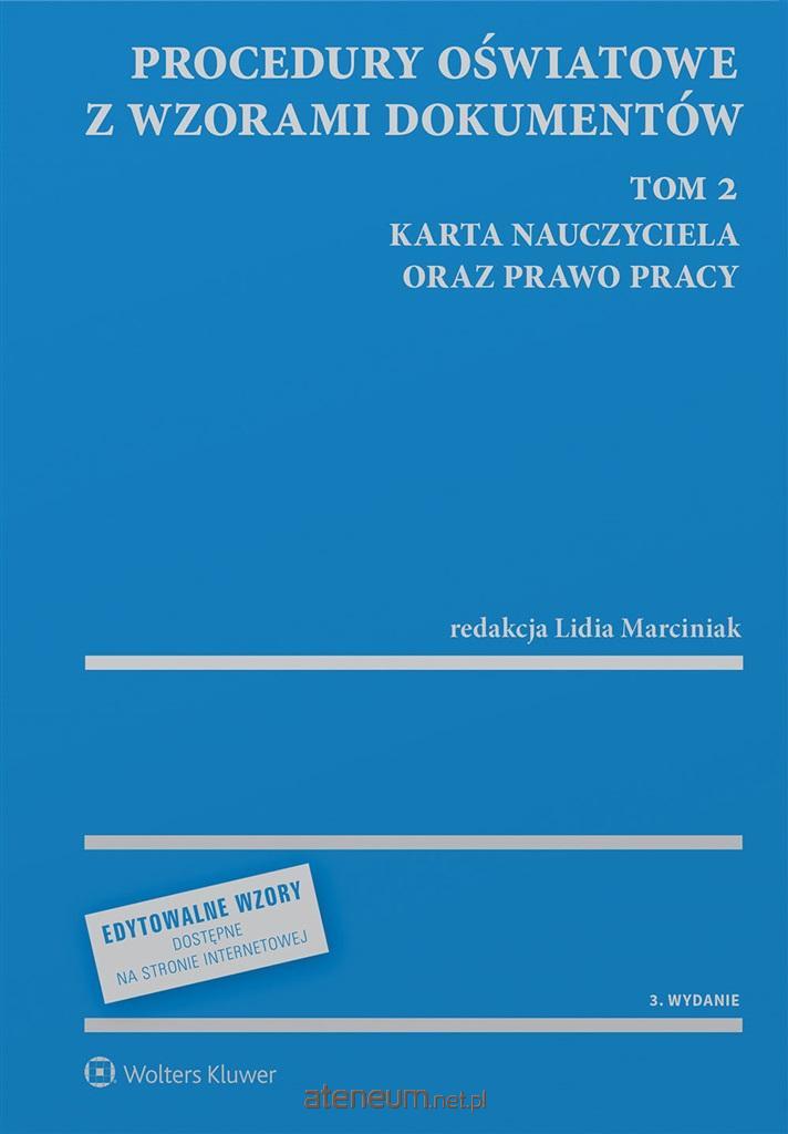 Publikacja zawiera obszerny zbiór procedur stosowanych w szkołach, przedszkolach, placówkach oświatowych oraz organach prowadzących i sprawujących nad nimi nadzór, które wynikają zarówno z przepisów Karty Nauczyciela, ustawy o pracownikach samorządowych, jak i regulacji Kodeksu pracy oraz aktów wykonawczych. Dotyczą one takich zagadnień, jak: nawiązanie, rozwiązanie i wygaśnięcie stosunku pracy nauczycieli, wynagradzanie, czas pracy i urlopy nauczycieli, awans zawodowy oraz ocena pracy nauczycieli, ochrona zdrowia nauczycieli oraz ich uprawnienia socjalne, kary porządkowe i odpowiedzialność dyscyplinarna, prawo pracy pracowników samorządowej administracji szkolnej i obsługi. Każda procedura wskazuje odpowiednio: termin wykonania danego zadania, podmioty uczestniczące w jego realizacji, wzory dokumentów oraz podstawę prawną wraz z komentarzem. Publikacja uwzględnia najnowsze zmiany legislacyjne: - wprowadzające zmiany w urlopach i uprawnieniach rodzicielskich, zwolnieniach od pracy, zawieraniu i wypowiadaniu umów o pracę, zmiany w informacji o warunkach zatrudnienia - określające nowe zasady pracy zdalnej - dotyczące awans zawodowego i oceny pracy nauczycieli. Książka jest przeznaczona dla dyrektorów i nauczycieli publicznych oraz niepublicznych przeszkoli, szkół i placówek. Może również zainteresować organy prowadzące oraz organy nadzoru pedagogicznego, a także słuchaczy podyplomowych studiów Zarządzania oświatą.