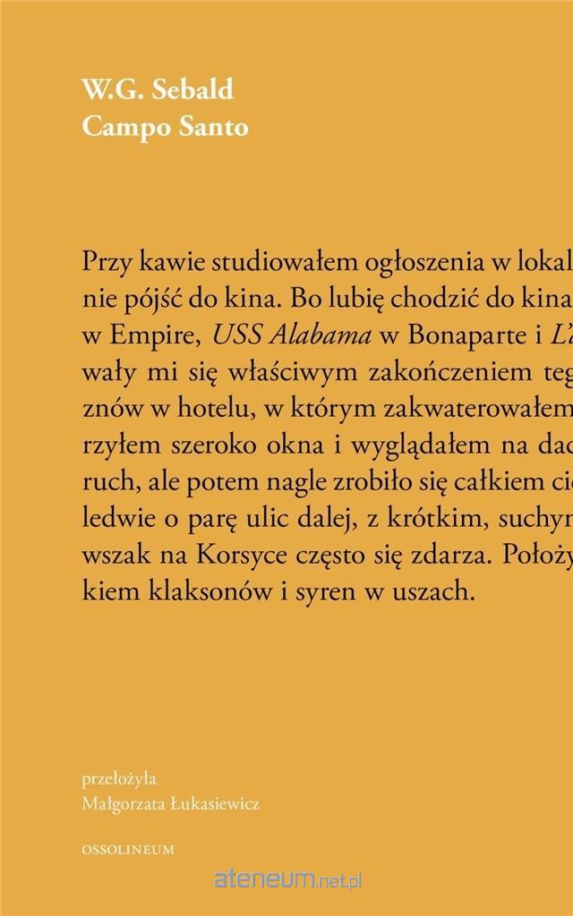 Campo Santo jest świadectwem ewolucji twórczości W.G. Sebalda: począwszy od prac literaturoznawczych, przez brawurową, wyzwoloną z gorsetu naukowości eseistykę, aż po niedającą się sklasyfikować gatunkowo prozę. Na tom składają się cztery utwory napisane do książki o Korsyce, która nigdy nie została ukończona, a także kilkanaście szkiców poświęconych postaciom takim jak Jean Amry, Bruce Chatwin, Peter Handke, Franz Kafka, Alexander Kluge czy Vladimir Nabokov.