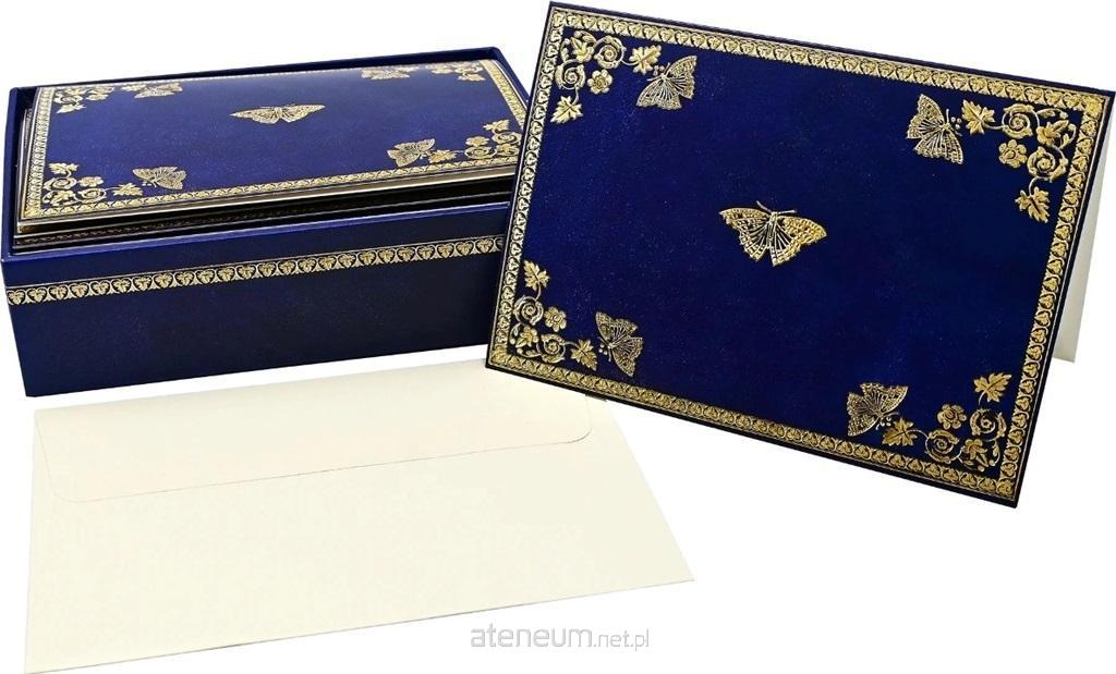 "Elegancka kolekcja zdobionych karnetów na każdą okazję marki Peter Pauper Press Pozłacane Motyle (Gilded Butterflies). Wzór na każdej kartce jest lekko tłoczony, zdobiony złotą folią, na głębokim granatowym tle. Koperty są w kolorze kości słoniowej. Całość zapakowana w pudełko z tym samym wzorem. Uniwersalna otwierana kartka okolicznościowa z pustym środkiem pozwala na pełną personalizację i stworzenie wyjątkowej pamiątki dla obdarowanej osoby.