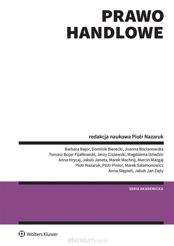 Podręcznik w przystępny sposób prezentuje całość problematyki z zakresu prawa handlowego. Poza przedstawieniem fundamentalnej tematyki, takiej jak: zagadnienia ogólne prawa handlowego, ustrój prawny przedsiębiorców, prawo spółek, prawo umów handlowych oraz prawo papierów wartościowych i instrumentów finansowych, autorzy omawiają zagadnienia specjalistyczne: prawo restrukturyzacyjne i upadłościowe, prawo własności przemysłowej i prawo spółdzielcze. Na początku każdego rozdziału wskazano rozbudowaną literaturę przedmiotu, a w treści - liczne odesłania do poglądów doktryny i orzecznictwa. W podręczniku omówiono również pozasądowe metody rozwiązywania sporów gospodarczych, zagadnienia z zakresu prawa handlowego państw obcych oraz spółek specjalnych wskazanych w art. 611 k.s.h. Książka jest opracowaniem zbiorowym kilkunastu autorów: profesorów i adiunktów wielu polskich uczelni prawniczych oraz uznanych praktyków wykonujących zawody adwokata, notariusza, radcy prawnego i sędziego. Publikacja jest przeznaczona przede wszystkim dla studentów jednolitych studiów prawniczych, którzy przygotowują się do zaliczeń i egzaminów z przedmiotu prawo handlowe oraz przedmiotów specjalizacyjnych z zakresu prawa handlowego. Może być z powodzeniem wykorzystywana także przez studentów innych kierunków z zakresu nauk społecznych i ekonomicznych. Zaprezentowane analizy będą ponadto przydatne dla praktyków wykonujących zawody prawnicze oraz inne zawody związane z funkcjonowaniem obrotu gospodarczego.