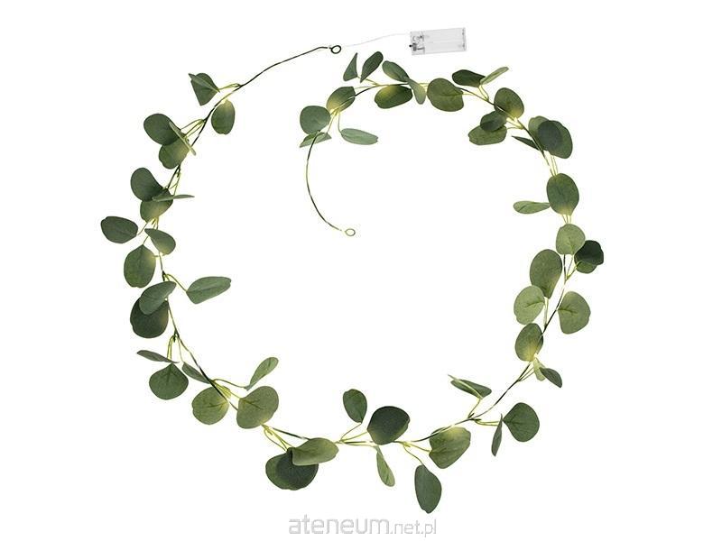 Girlanda Eukaliptus w kolorze zielonym z 20 lampkami LED o ciepłej barwie światła, długość ok. 2 m. Przeznaczone do użytku wewnętrznego, zasilane bateriami 2 x AA (nie dołączone). Brak możliwości łączenia z innym zestawem oświetleniowym. Napięcie znamionowe: 3V, Moc znamionowa: 0.6W, Moc żarówki: 0.03W.