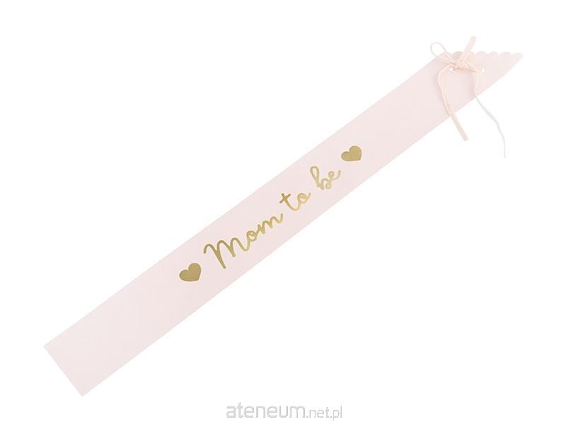 Szarfa wykonana z papieru w kolorze bladoróżowym ze złotym napisem "Mom to be", szerokość ok. 9.5 cm, długość ok. 75 cm.